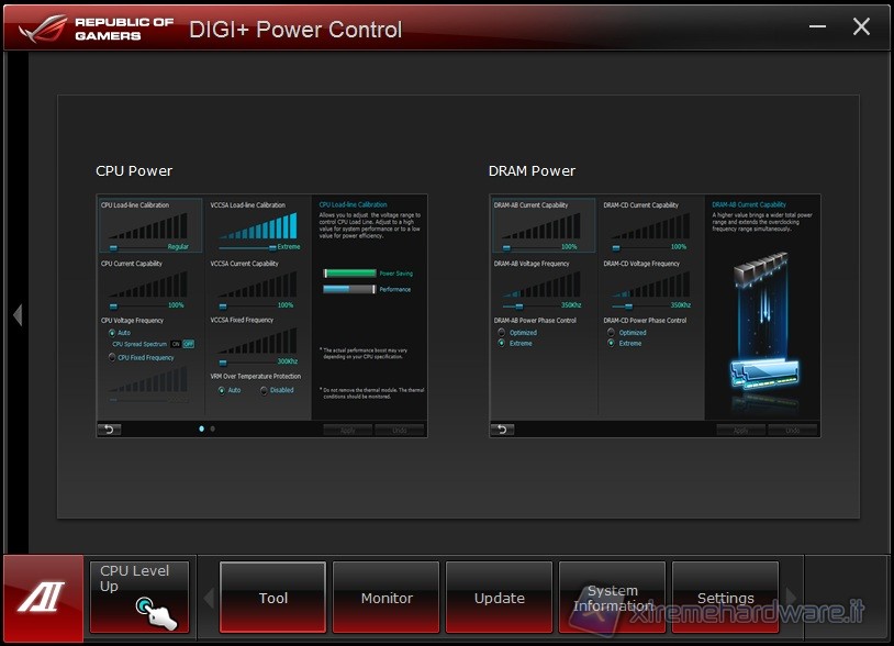 Grazie al solido sistema di alimentazione DIGI+ che accompagna la Rampage IV Formula come tutta la serie ROG, si può agire anche tramite l’interfaccia software Asus DIGI+ regolando il livello del Load-line Calibration, molto importante per rendere quanto più stabile possibile l’erogazione della tensione alla CPU anche in presenza di forte assorbimento. Altro tool fondamentale per effettuare l’overclock del sistema senza dover ogni volta riavviare e rientrare nel bios, è il conosciutissimo TurboV EVO che vi mostriamo di seguito