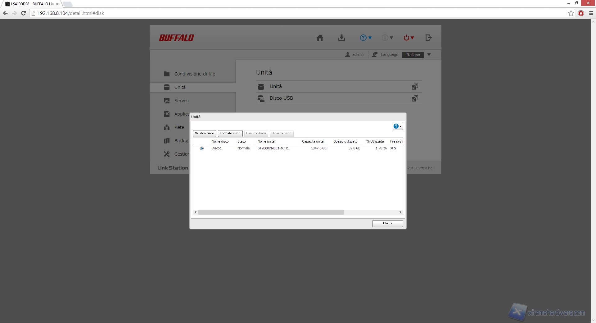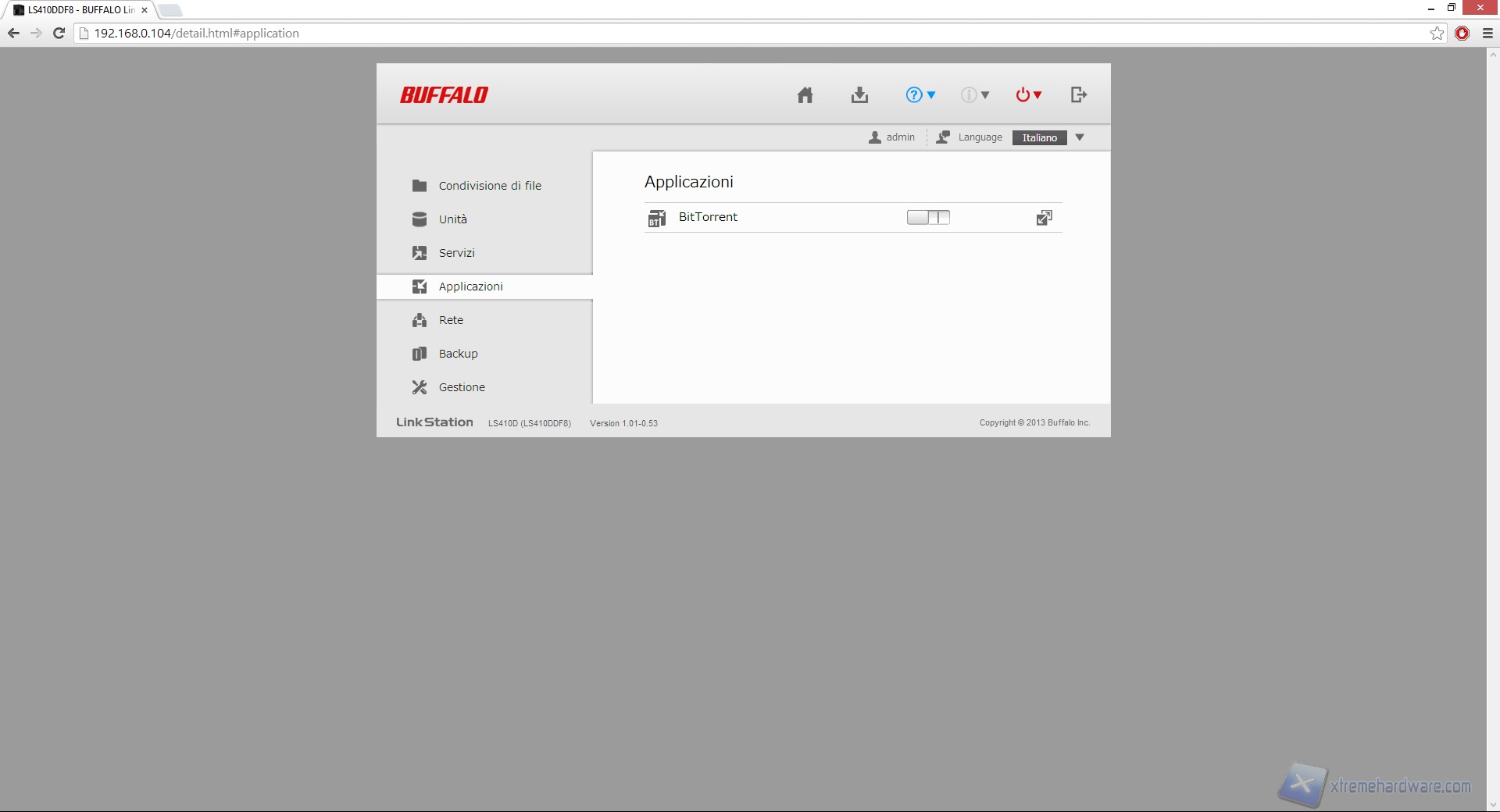 Nella sezione "Unità" abbiamo la possibilità di vedere lo status del disco interno o formattarlo, mentre andando avanti nel sotto-menù "Servizi" e "BitTorrent" possiamo abilitare o disabilitare quelle funzioni che troviamo in prima pagina e che abbiamo già descritto.