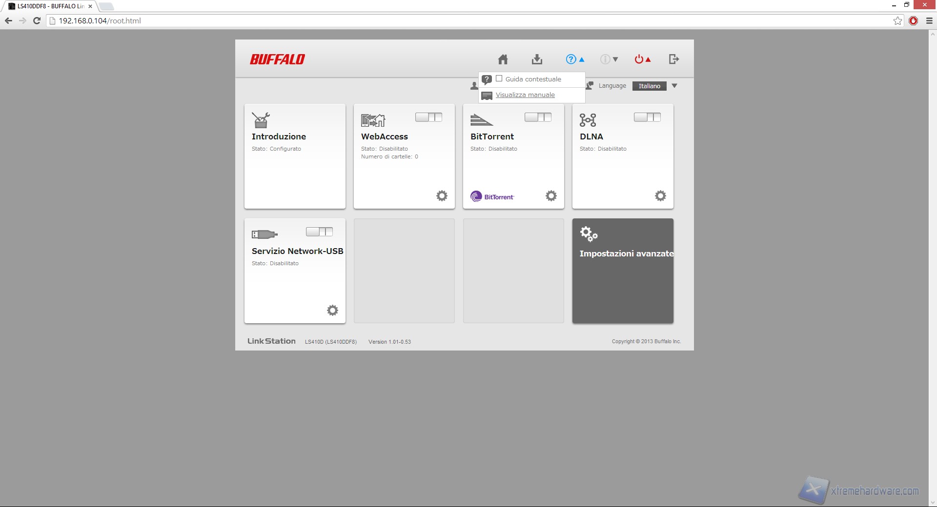 Nella parte alta troviamo le icone relative all'help, alla pagina di download di materiale inerente al prodotto dalla pagina Buffalo (manuali, software aggiornato), icona relativa alle notifiche, quella di riavvio di sistema e di logout.